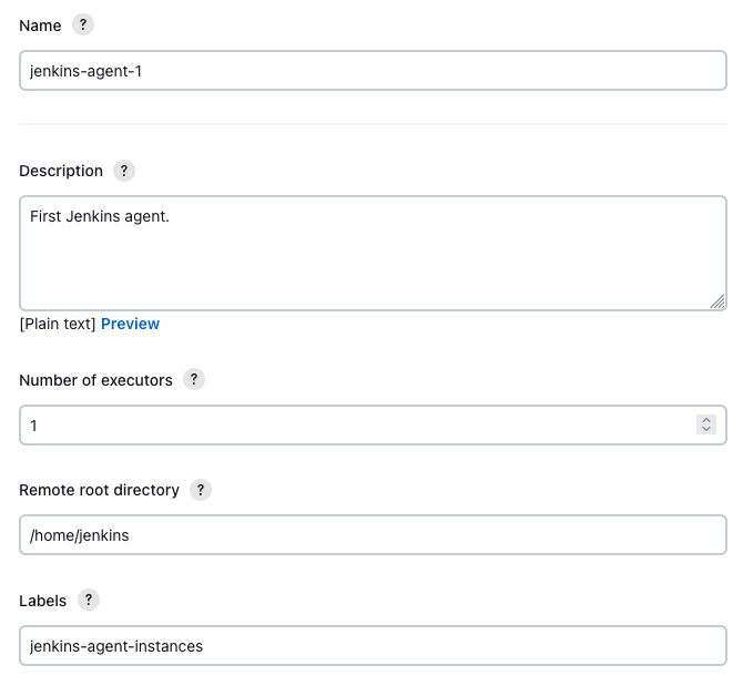The docker-node naming can later help to distinguish these agents as ones with Docker and Node.js installed. The label field adds a tag to each agent, providing a convenient way to designate specific sets of agent for executing pipelines.